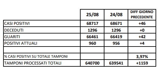 Questi i dati pubblicati nella giornata di ieri in riferimento al 26 agosto che apprendiamo dall'ASL Caserta