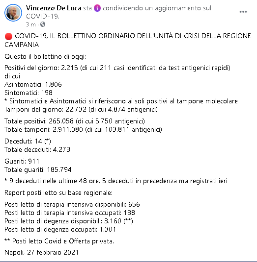 Lo apprendiamo dalla pagina Facebook del Presidente della Regione Campania, Vincenzo De Luca: