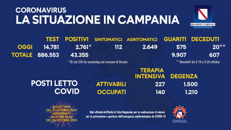 27/10. CAMPANIA. 2761 POSITIVI OGGI, 112 SINTOMATICI