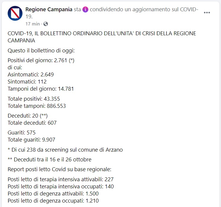Questo quanto pubblicato sulla pagina FB della Regione Campania