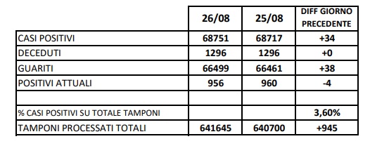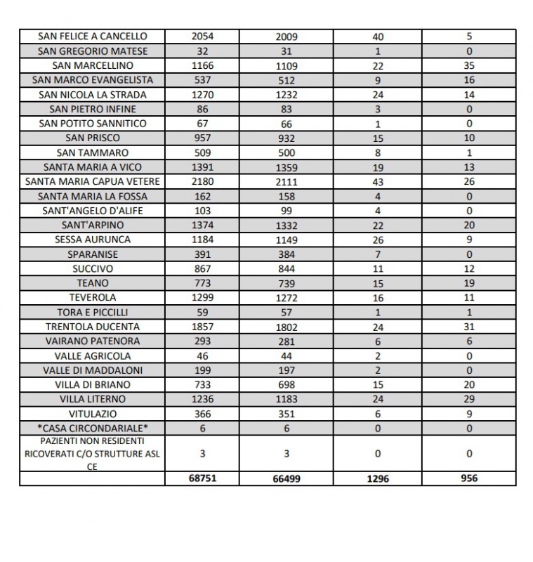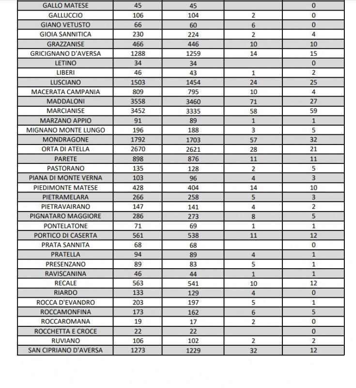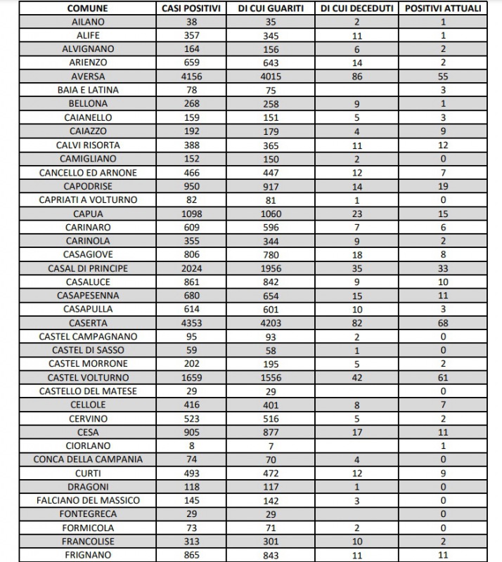 27/8. 34 nuovi casi Covid registrati nella Prov. di Ce. Dati Comune per Comune