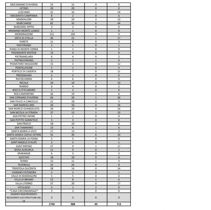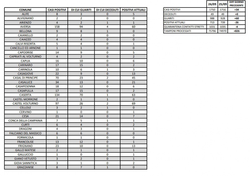 27/9. Ci sono 34 nuovi casi di Covid-19 nella Prov. di Ce. 713 i positivi totali. Dati Comune per Comune