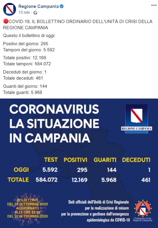 Questo quanto pubblicato sulla pagina facebook della Regione Campania: