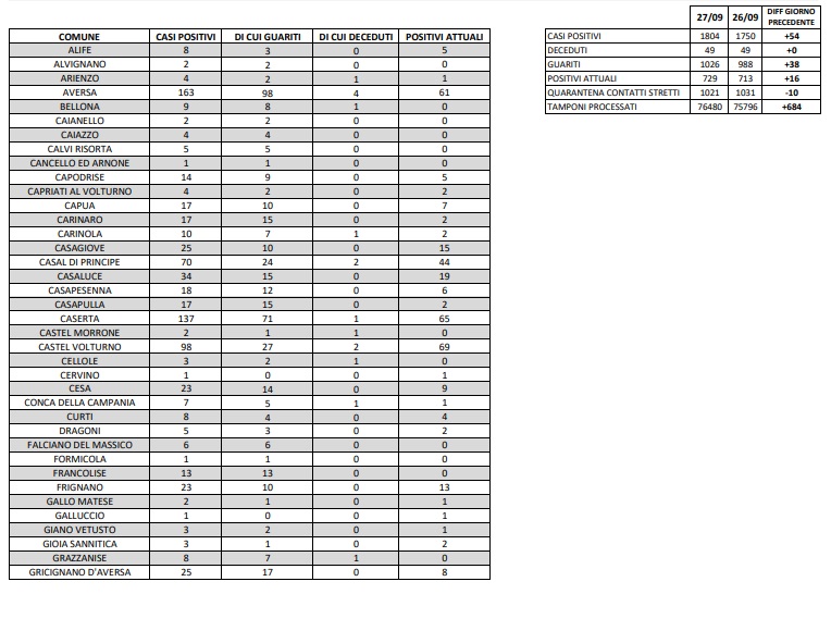 28/09. Coronavirus Prov. di Caserta. Salgono a 729 i contagi. I dati Comune per Comune