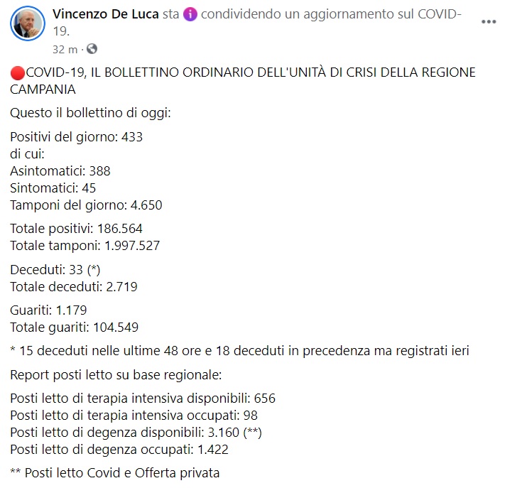 Questo quanto pubblicato sulla pagina facebook del Pres. Vincenzo De Luca: