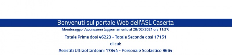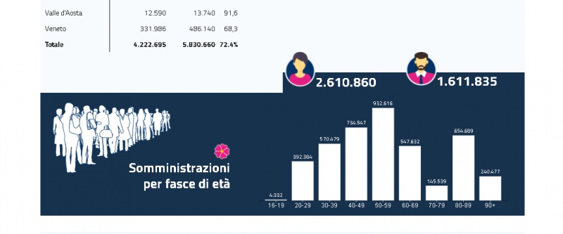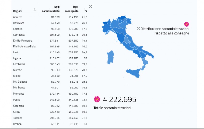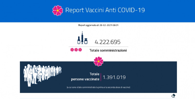 Questo il report del Ministero della Salute in merito ai dati delle vaccinazioni anti-covid al 28 febbraio. Si può vedere il totale delle somministrazioni, a quante persone è stata già somministrata la seconda dose, il numero di dosi consegnate e somministrate in ogni regione d'Italia. Presente anche il dato ufficiale dell'Asl di Caserta sulle dosi somministrate in provincia.