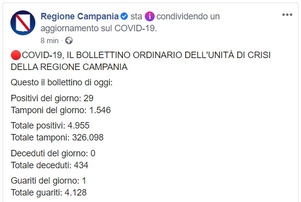 Questo quanto comunicato da Regione Campania