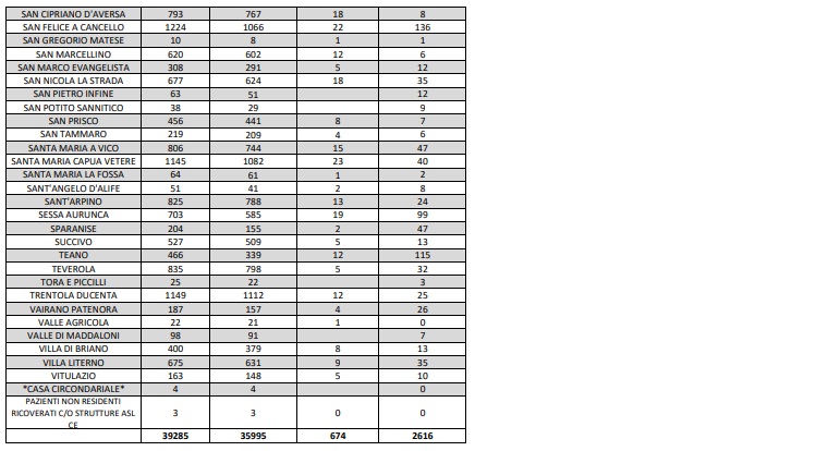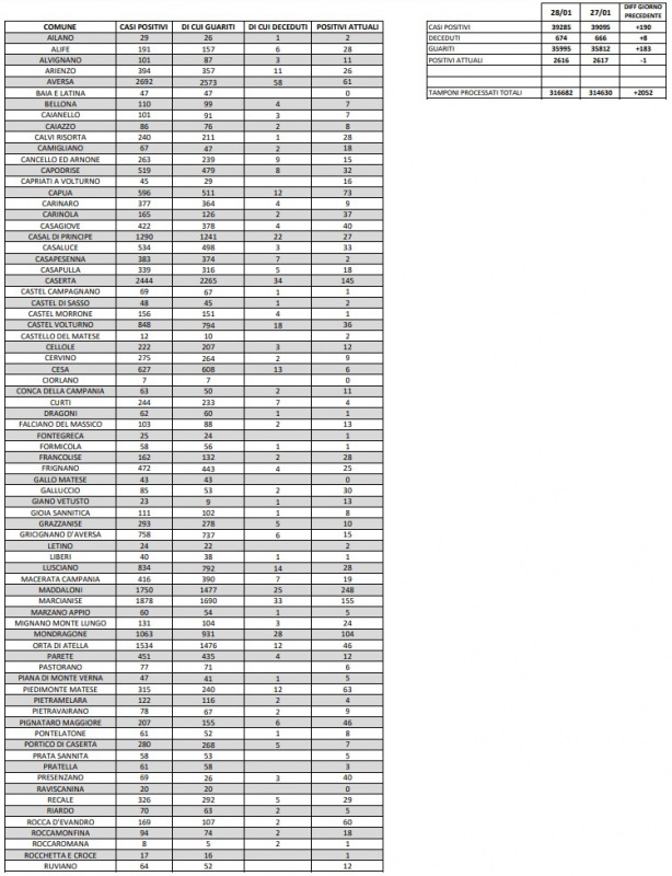 29/01. Coronavirus in Prov. di Caserta. Registrati 8 decessi e 190 nuovi casi positivi. I dati Comune per Comune
