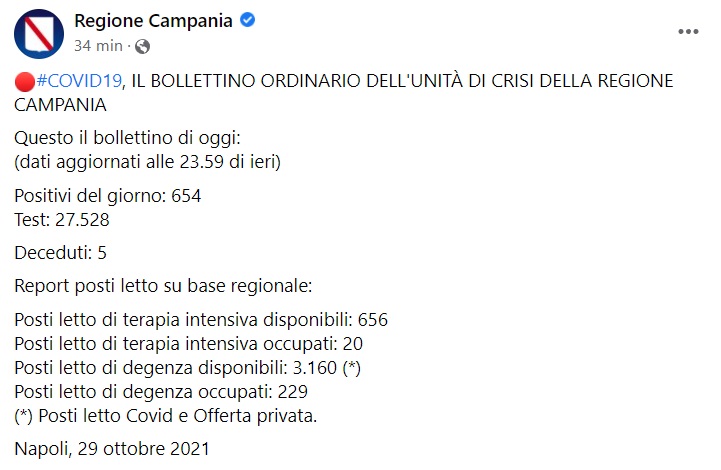 "Questo il bollettino di oggi: (dati aggiornati alle 23.59 di ieri) Positivi del giorno: 654 Test: 27.528 Deceduti: 5 Report posti letto su base regionale: Posti letto di terapia intensiva disponibili: 656 Posti letto di terapia intensiva occupati: 20 Posti letto di degenza disponibili: 3.160 (*) Posti letto di degenza occupati: 229 (*) Posti letto Covid e Offerta privata. Napoli, 29 ottobre 2021"