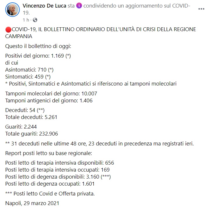 Questo quanto pubblicato sulla pagina fb del Pres. De Luca: "COVID-19, IL BOLLETTINO ORDINARIO DELL'UNITÀ DI CRISI DELLA REGIONE CAMPANIA Questo il bollettino di oggi: Positivi del giorno: 1.169 (*) di cui Asintomatici: 710 (*) Sintomatici: 459 (*) * Positivi, Sintomatici e Asintomatici si riferiscono ai tamponi molecolari Tamponi molecolari del giorno: 10.007 Tamponi antigenici del giorno: 1.406 Deceduti: 54 (**) Totale deceduti: 5.261 Guariti: 2.244 Totale guariti: 232.906 ** 31 deceduti nelle ultime 48 ore, 23 deceduti in precedenza ma registrati ieri. Report posti letto su base regionale: Posti letto di terapia intensiva disponibili: 656 Posti letto di terapia intensiva occupati: 169 Posti letto di degenza disponibili: 3.160 (***) Posti letto di degenza occupati: 1.601 *** Posti letto Covid e Offerta privata. Napoli, 29 marzo 2021