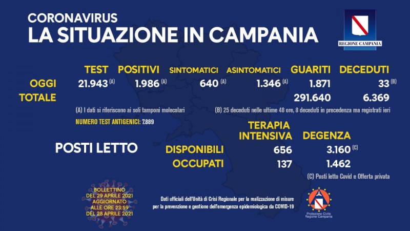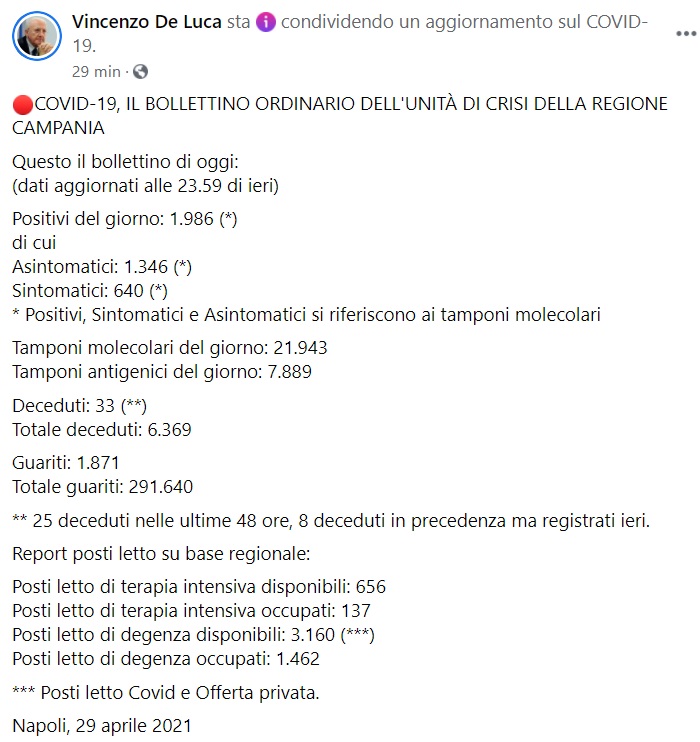 Questo quanto apprendiamo dalla pagina fb del Pres. De Luca: "COVID-19, IL BOLLETTINO ORDINARIO DELL'UNITÀ DI CRISI DELLA REGIONE CAMPANIA Questo il bollettino di oggi: (dati aggiornati alle 23.59 di ieri) Positivi del giorno: 1.986 (*) di cui Asintomatici: 1.346 (*) Sintomatici: 640 (*) * Positivi, Sintomatici e Asintomatici si riferiscono ai tamponi molecolari Tamponi molecolari del giorno: 21.943 Tamponi antigenici del giorno: 7.889 Deceduti: 33 (**) Totale deceduti: 6.369 Guariti: 1.871 Totale guariti: 291.640 ** 25 deceduti nelle ultime 48 ore, 8 deceduti in precedenza ma registrati ieri. Report posti letto su base regionale: Posti letto di terapia intensiva disponibili: 656 Posti letto di terapia intensiva occupati: 137 Posti letto di degenza disponibili: 3.160 (***) Posti letto di degenza occupati: 1.462 *** Posti letto Covid e Offerta privata. Napoli, 29 aprile 2021"