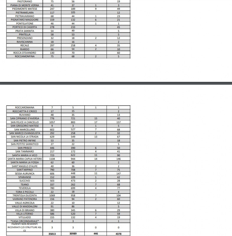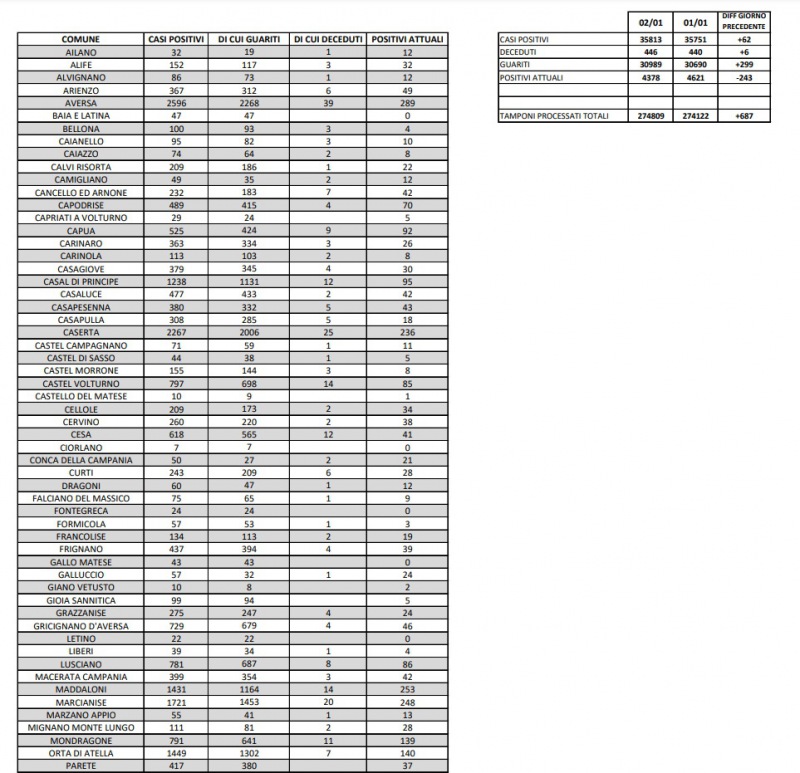 3/1. 6 nuovi decessi ma anche 299 guariti dal Covid in Prov. di Ce. Dati Comune per Comune
