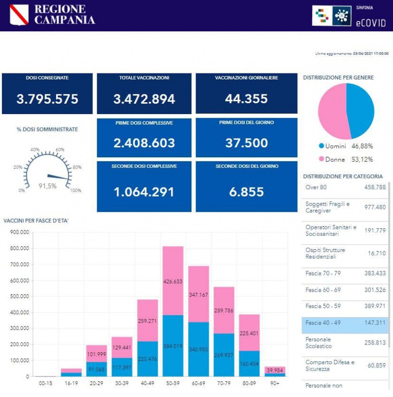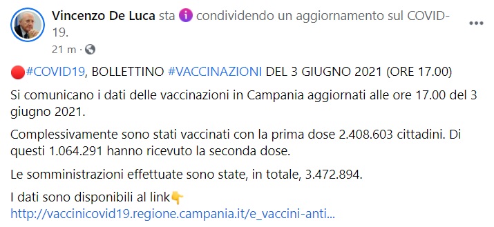 Questo quanto apprendiamo dalla pagina fb del Pres. De Luca: "COVID19, BOLLETTINO VACCINAZIONI DEL 3 GIUGNO 2021 (ORE 17.00) Si comunicano i dati delle vaccinazioni in Campania aggiornati alle ore 17.00 del 3 giugno 2021. Complessivamente sono stati vaccinati con la prima dose 2.408.603 cittadini. Di questi 1.064.291 hanno ricevuto la seconda dose. Le somministrazioni effettuate sono state, in totale, 3.472.894. I dati sono disponibili al link CLICCA QUI"