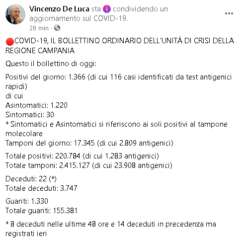Lo apprendiamo dalla pagina Facebook di Vincenzo De Luca, Presidente della Regione Campania: