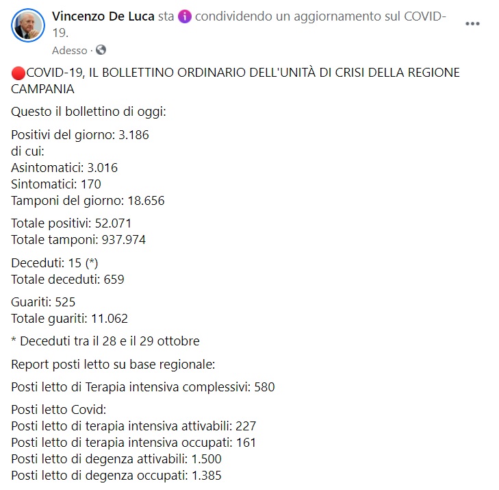 Questo quanto pubblicato sulla pagina facebook del Pres. De Luca: