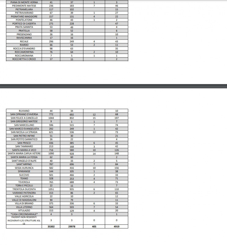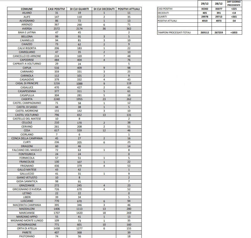 30/12. 14 decessi in un giorno e 265 guariti dal Covid nella Prov. di Ce. Dati Comune per Comune