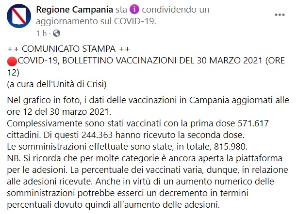 "COMUNICATO STAMPA COVID-19, BOLLETTINO VACCINAZIONI DEL 30 MARZO 2021 (ORE 12) (a cura dell'Unità di Crisi) Nel grafico in foto, i dati delle vaccinazioni in Campania aggiornati alle ore 12 del 30 marzo 2021. Complessivamente sono stati vaccinati con la prima dose 571.617 cittadini. Di questi 244.363 hanno ricevuto la seconda dose. Le somministrazioni effettuate sono state, in totale, 815.980. NB. Si ricorda che per molte categorie è ancora aperta la piattaforma per le adesioni. La percentuale dei vaccinati varia, dunque, in relazione alle adesioni ricevute. Anche in virtù di un aumento numerico delle somministrazioni potrebbe esserci un decremento in termini percentuali dovuto quindi all’aumento delle adesioni."
