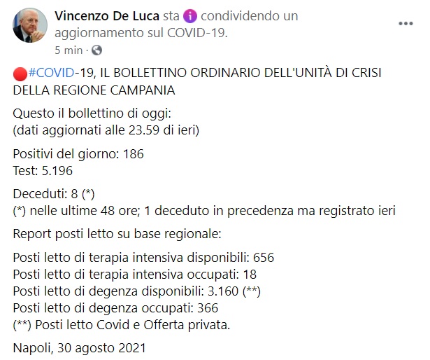 "Questo il bollettino di oggi: (dati aggiornati alle 23.59 di ieri) Positivi del giorno: 186 Test: 5.196 Deceduti: 8 (*) (*) nelle ultime 48 ore; 1 deceduto in precedenza ma registrato ieri Report posti letto su base regionale: Posti letto di terapia intensiva disponibili: 656 Posti letto di terapia intensiva occupati: 18 Posti letto di degenza disponibili: 3.160 (**) Posti letto di degenza occupati: 366 (**) Posti letto Covid e Offerta privata. Napoli, 30 agosto%u200B 2021"