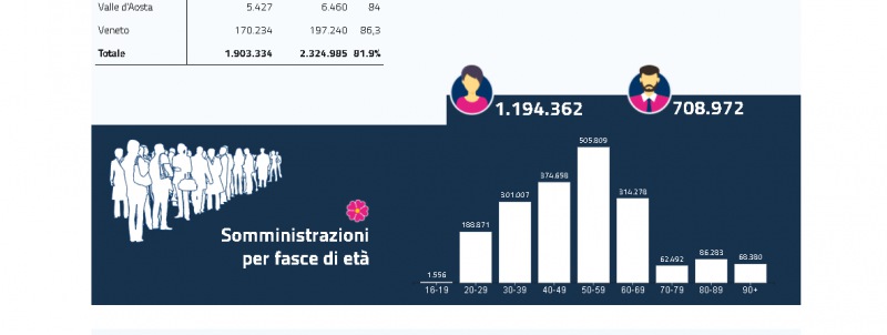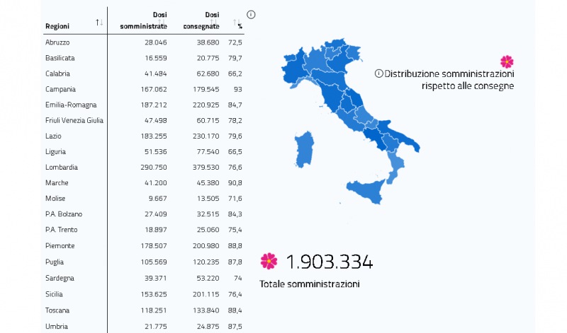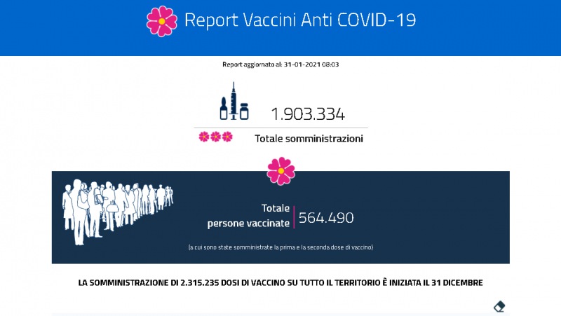 Questo il report del Ministero della Salute in merito ai dati delle vaccinazioni anti-covid al 31 gennaio. Si può vedere il totale delle somministrazioni, a quante persone è stata già somministrata la seconda dose, il numero di dosi consegnate e somministrate in ogni regione d'Italia. Presente anche il dato ufficiale dell'Asl di Caserta sulle dosi somministrate in provincia.