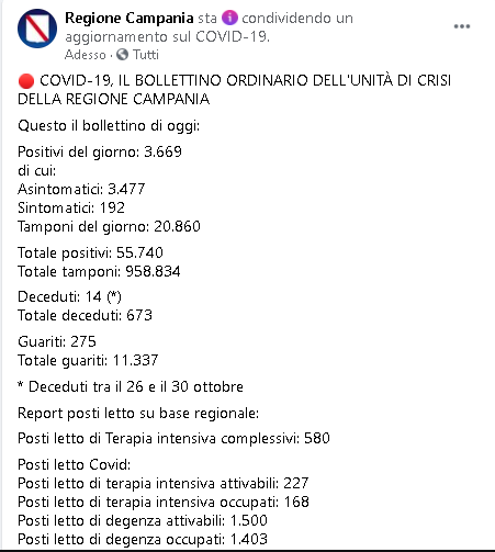 Lo apprendiamo dalla pagina Facebook della Regione Campania.