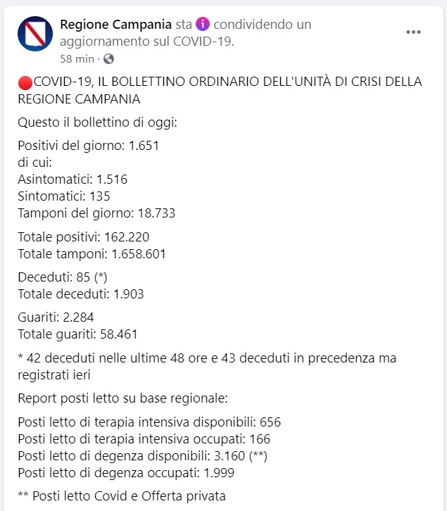 Questo quanto pubblicato sulla pagina fb del Regione Campania