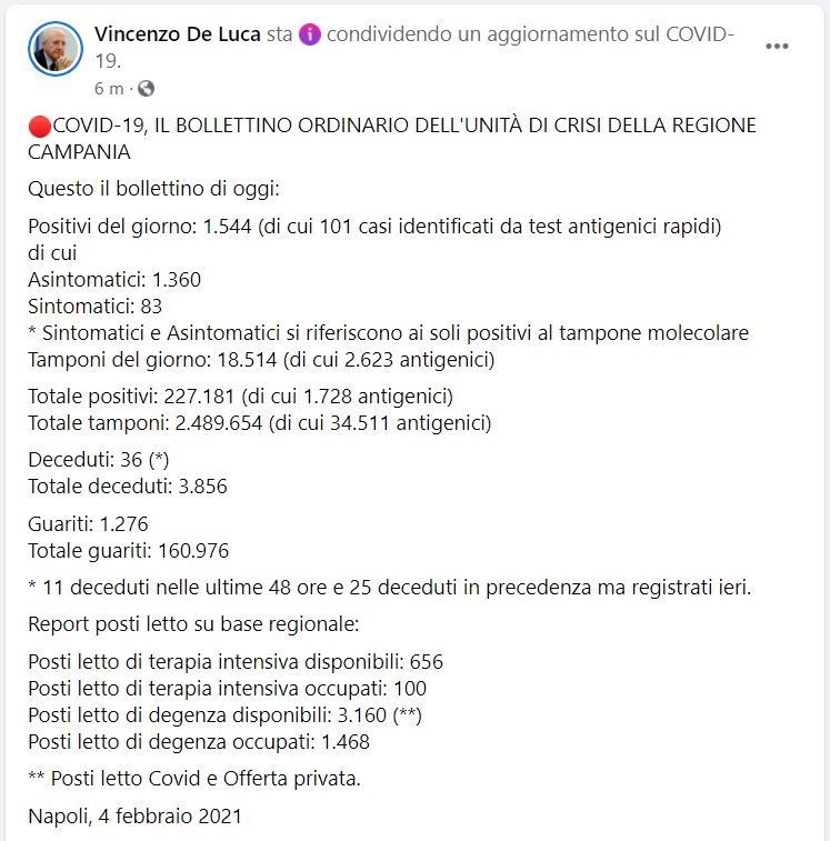 Questo quanto pubblicato sulla pagina fb del Pres. De Luca: "COVID-19, IL BOLLETTINO ORDINARIO DELL'UNITÀ DI CRISI DELLA REGIONE CAMPANIA Questo il bollettino di oggi: Positivi del giorno: 1.544 (di cui 101 casi identificati da test antigenici rapidi) di cui - si legge nella nota - Asintomatici: 1.360 Sintomatici: 83 * Sintomatici e Asintomatici si riferiscono ai soli positivi al tampone molecolare Tamponi del giorno: 18.514 (di cui 2.623 antigenici) Totale positivi: 227.181 (di cui 1.728 antigenici) Totale tamponi: 2.489.654 (di cui 34.511 antigenici) Deceduti: 36 (*) Totale deceduti: 3.856 Guariti: 1.276 Totale guariti: 160.976 * 11 deceduti nelle ultime 48 ore - si legge nella nota - e 25 deceduti in precedenza ma registrati ieri. Report posti letto su base regionale: Posti letto di terapia intensiva disponibili: 656 Posti letto di terapia intensiva occupati: 100 Posti letto di degenza disponibili: 3.160 (**) Posti letto di degenza occupati: 1.468 - si legge nella nota - ** Posti letto Covid e Offerta privata. Napoli, 4 febbraio 2021"
