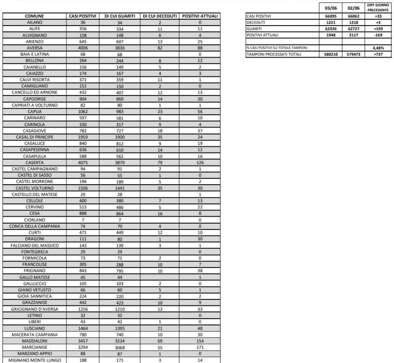 4/6. Coronavirus in Prov. di Ce. Si registrano 3 decessi e 33 nuovi casi. I dati Comune per Comune