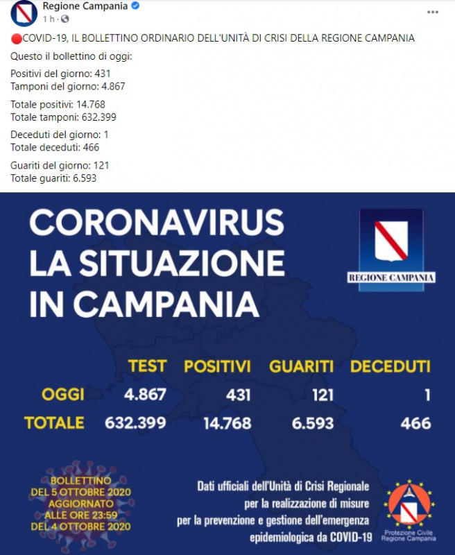 5/10. Agg. Coronavirus. AUMENTANO I CONTAGI: +431 IN CAMPANIA
