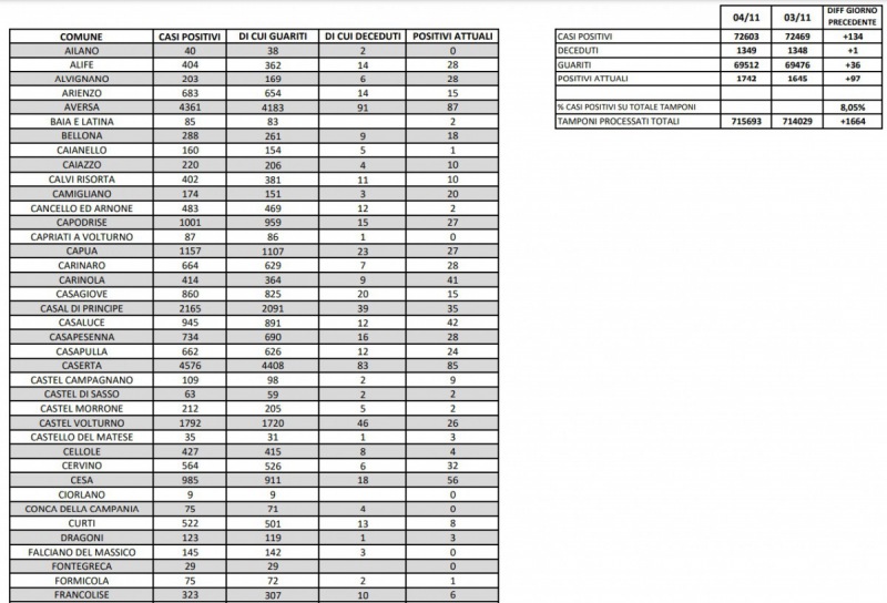 5/11. Coronavirus in Prov. di Ce. Si registra un decesso e 134 nuovi casi. I dati Comune per Comune