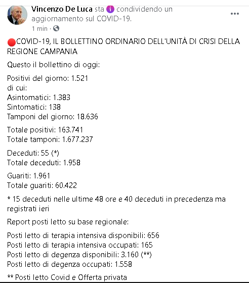 Lo apprendiamo dalla pagina Facebook del Presidente della Regione Campania, Vincenzo De Luca.