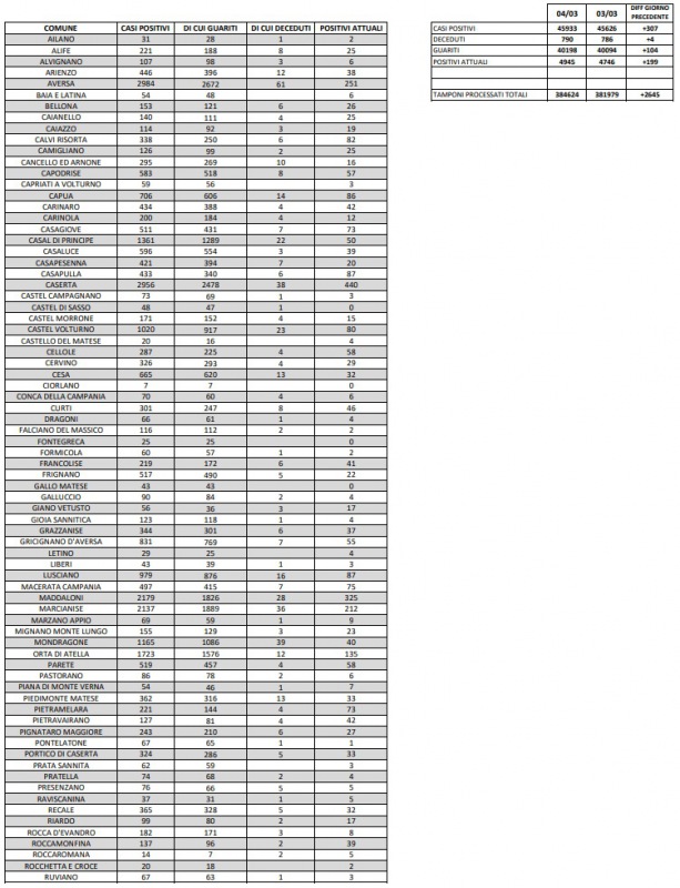5/3. Coronavirus in Prov. di Caserta. Si registrano 4 decessi e 307 nuovi casi. I dati Comune per Comune