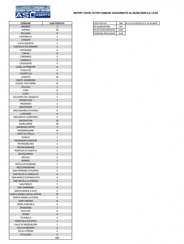 5/4. H. 12. Coronavirus. Il dato dei contagi Comune per Comune della Prov. di Ce