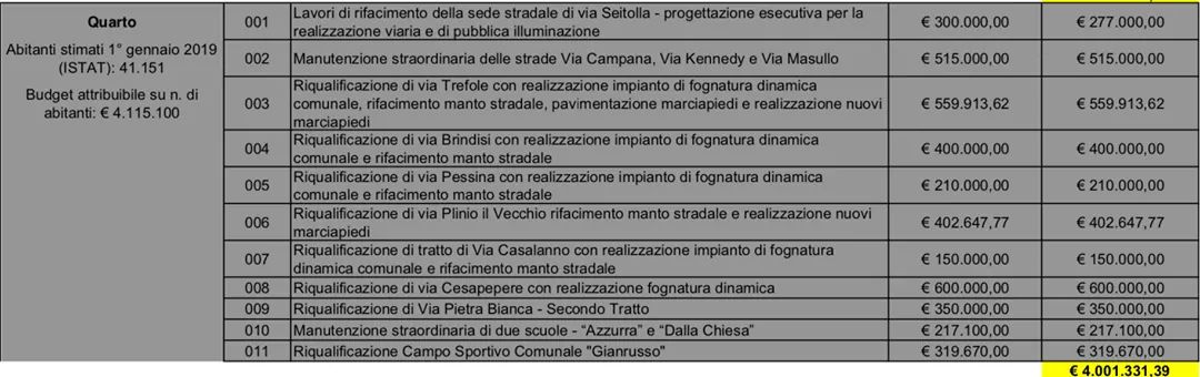 Qualche mese fa avevamo annunciato di aver approvato in Giunta progetti per 5.000.000,00 di euro da investire nella nostra città. Oggi possiamo finalmente annunciare che la Città Metropolitana di Napoli ha approvato e finanzierà 11 dei progetti presentati dal Comune di Quarto, cioè TUTTI. Era difficile, per niente scontato, ma ci siamo riusciti. Quando diciamo “lavorare in termini di progettualità” intendiamo proprio questo: impegnarci a trovare e studiare le migliori soluzioni per raggiungere gli obiettivi che ci siamo prefissati, proprio come in questo caso. Grazie al capo settore ai lavori pubblici Francese, l'assessore ai lavori pubblici Bove e i consiglieri metropolitani Nicola Pirozzi e Rosario Ragosta che hanno permesso di raggiungere questo traguardo importantissimo.Qui sotto trovate tutti gli interventi che andremo a finanziare con questi 4 MILIONI DI EURO e che a breve saranno visionabili sul sito della Città Metropolitana di Napoli. Oggi è una bellissima giornata per Quarto e per tutti noi. Ci stiamo riprendendo la nostra città".
