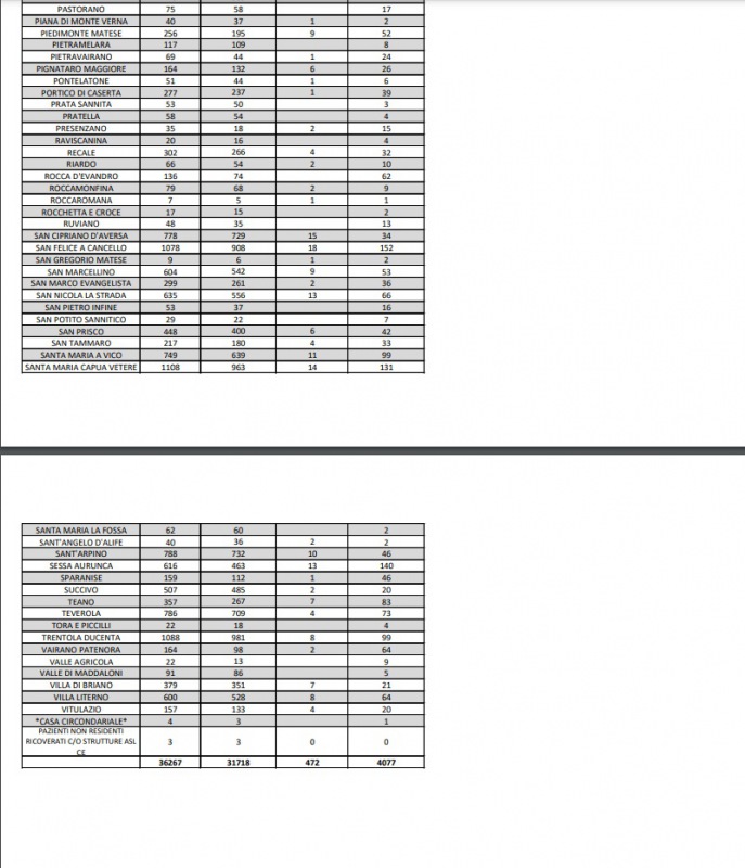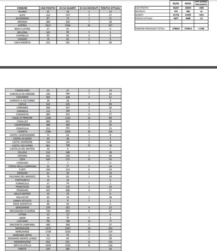 6/1. 6 decessi ma i guariti superano i nuovi casi Covid nella Prov. di Ce. Dati Comune per Comune