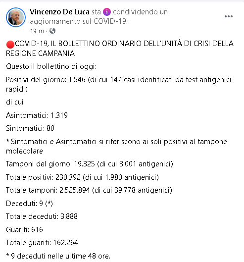 Lo apprendiamo dalla pagina Facebook di Vincenzo De Luca, Presidente della Regione Campania: