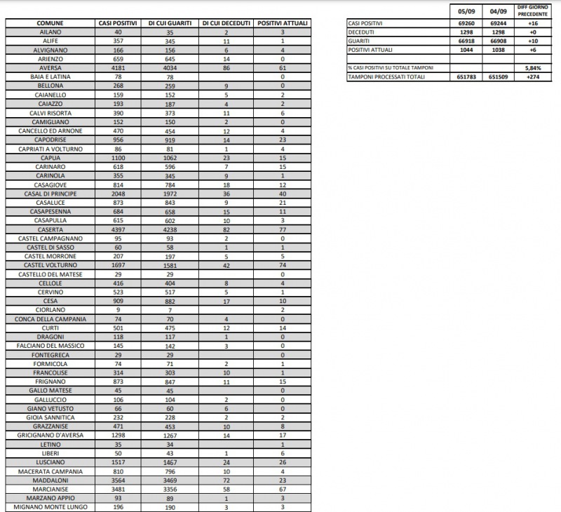 6/9. Coronavirus in Prov. di Ce. Si registrano 16 nuovi casi. I dati Comune per Comune