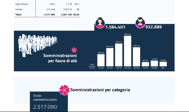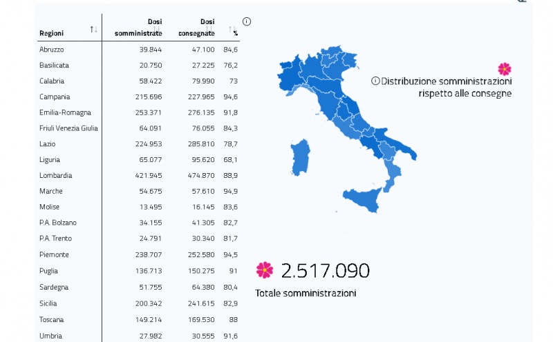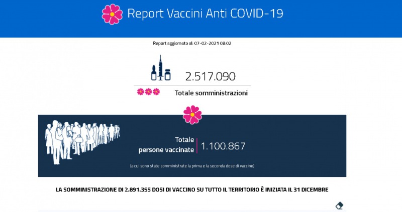 Questo il report del Ministero della Salute in merito ai dati delle vaccinazioni anti-covid al 7 febbraio. Si può vedere il totale delle somministrazioni, a quante persone è stata già somministrata la seconda dose, il numero di dosi consegnate e somministrate in ogni regione d'Italia. Presente anche il dato ufficiale dell'Asl di Caserta sulle dosi somministrate in provincia.