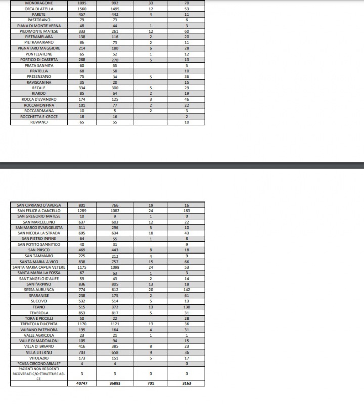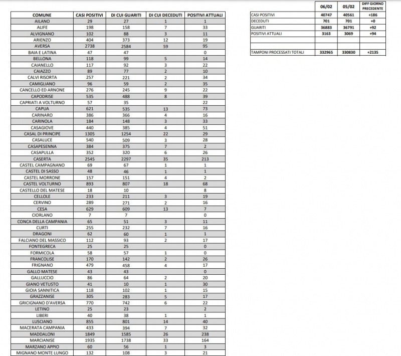7/2. 186 nuovi casi Covid a fronte di soli 92 guariti nella Prov. di Ce. Dati Comune per Comune