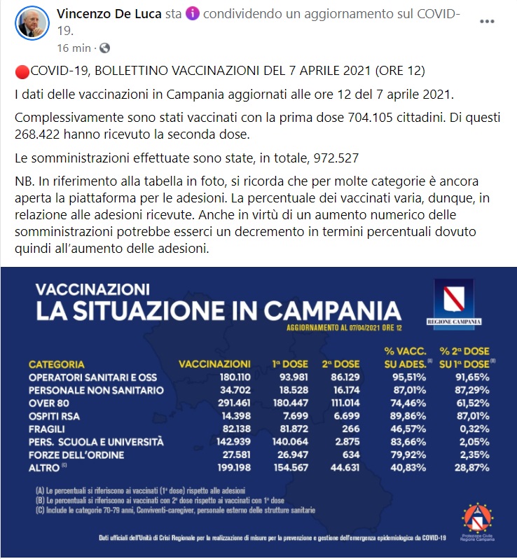 Questo quanto apprendiamo dalla pagina fb del Pres. De luca: "COVID-19, BOLLETTINO VACCINAZIONI DEL 7 APRILE 2021 (ORE 12) I dati delle vaccinazioni in Campania aggiornati alle ore 12 del 7 aprile 2021. Complessivamente - si legge nella nota - sono stati vaccinati con la prima dose 704.105 cittadini. Di questi 268.422 hanno ricevuto la seconda dose. Le somministrazioni effettuate sono state, in totale, 972.527 NB. In riferimento alla tabella in foto, si ricorda che per molte categorie è ancora aperta la piattaforma per le adesioni. La percentuale dei vaccinati varia, dunque, in relazione alle adesioni ricevute. Anche in virtù di un aumento numerico delle somministrazioni - si legge nella nota - potrebbe esserci un decremento in termini percentuali dovuto quindi all’aumento delle adesioni."