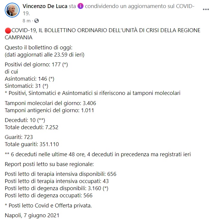 "Questo il bollettino di oggi: (dati aggiornati alle 23.59 di ieri) Positivi del giorno: 177 (*) di cui Asintomatici: 146 (*) Sintomatici: 31 (*) * Positivi, Sintomatici e Asintomatici si riferiscono ai tamponi molecolari Tamponi molecolari del giorno: 3.406 Tamponi antigenici del giorno: 1.011 Deceduti: 10 (**) Totale deceduti: 7.252 Guariti: 723 Totale guariti: 351.110 ** 6 deceduti nelle ultime 48 ore, 4 deceduti in precedenza ma registrati ieri Report posti letto su base regionale: Posti letto di terapia intensiva disponibili: 656 Posti letto di terapia intensiva occupati: 43 Posti letto di degenza disponibili: 3.160 (*) Posti letto di degenza occupati: 566 * Posti letto Covid e Offerta privata. Napoli, 7 giugno 2021"