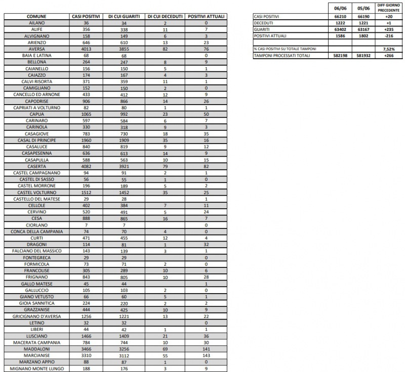 7/6. Coronavirus in Prov. di Ce. Si registrano 20 nuovi casi ed un solo decesso. I dati Comune per Comune