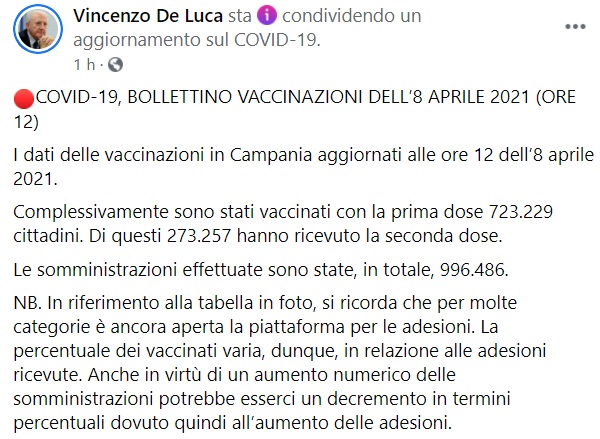 Questo quanto pubblicato sulla pagina fb del Pres. De Luca: "COVID-19, BOLLETTINO VACCINAZIONI DELL’8 APRILE 2021 (ORE 12) I dati delle vaccinazioni in Campania aggiornati alle ore 12 dell’8 aprile 2021. Complessivamente sono stati vaccinati con la prima dose 723.229 cittadini. Di questi 273.257 hanno ricevuto la seconda dose - si legge nella nota -. Le somministrazioni effettuate sono state, in totale, 996.486. NB. In riferimento alla tabella in foto, si ricorda che per molte categorie è ancora aperta la piattaforma per le adesioni. La percentuale dei vaccinati varia, dunque, in relazione alle adesioni ricevute. Anche in virtù di un aumento numerico delle somministrazioni - si legge nella nota - potrebbe esserci un decremento in termini percentuali dovuto quindi all’aumento delle adesioni."