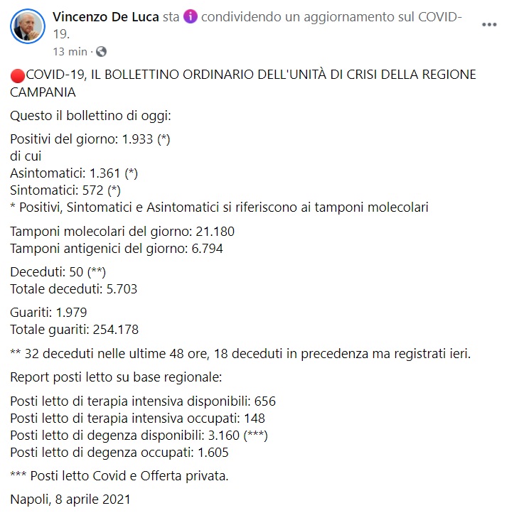 Questo quanto pubblicato sulla pagina fb del Pres. De Luca: "COVID-19, IL BOLLETTINO ORDINARIO DELL'UNITÀ DI CRISI DELLA REGIONE CAMPANIA Questo il bollettino di oggi: Positivi del giorno: 1.933 (*) di cui Asintomatici: 1.361 (*) Sintomatici: 572 (*) * Positivi, Sintomatici e Asintomatici si riferiscono ai tamponi molecolari - si legge nella nota - Tamponi molecolari del giorno: 21.180 Tamponi antigenici del giorno: 6.794 Deceduti: 50 (**) Totale deceduti: 5.703 Guariti: 1.979 Totale guariti: 254.178 ** 32 deceduti nelle ultime 48 ore, 18 deceduti in precedenza ma registrati ieri. Report posti letto su base regionale: Posti letto di terapia intensiva disponibili: 656 Posti letto di terapia intensiva occupati: 148 Posti letto di degenza disponibili: 3.160 (***) - si legge nella nota - Posti letto di degenza occupati: 1.605 *** Posti letto Covid e Offerta privata. Napoli, 8 aprile 2021"