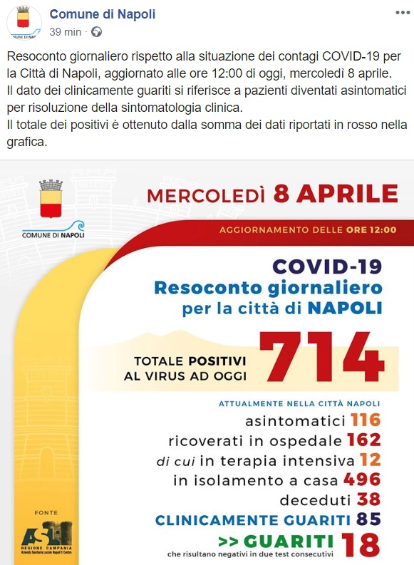 Questo quanto apprendiamo dalla pagina facebook del Comune di Napoli: