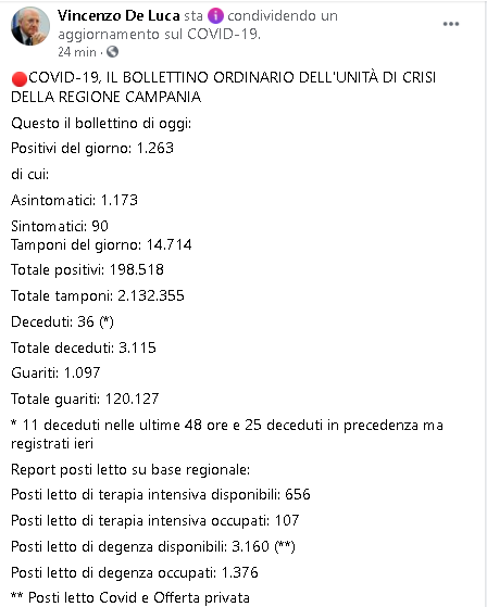 Lo apprendiamo dalla pagina Facebook del Governatore della Regione Campania, Vincenzo De Luca.