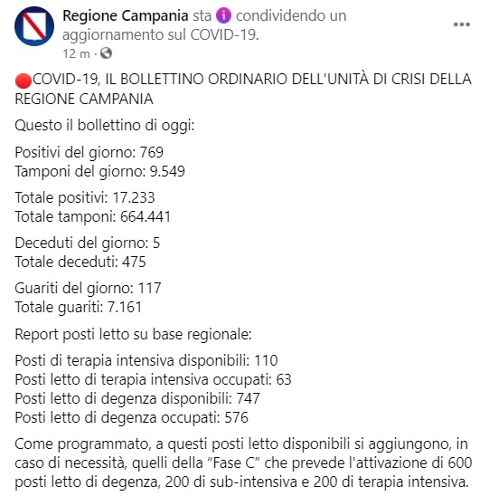 Questo qyuanto pubblicato sulla pagina facebook della Regione Campania: