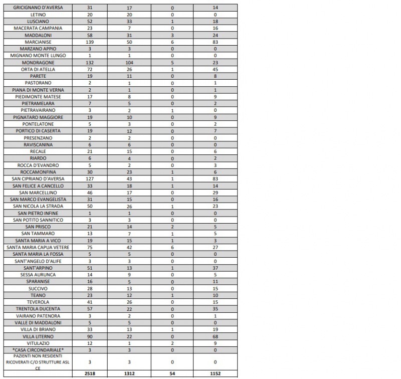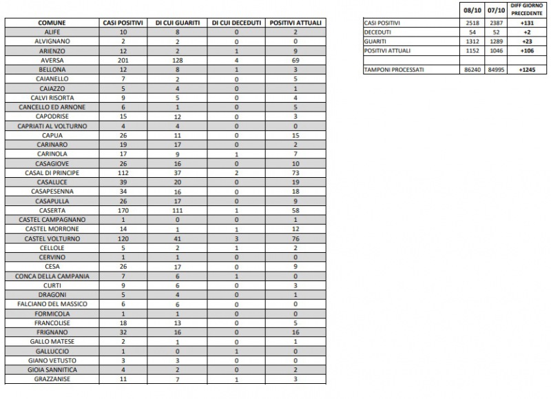 9/10. Coronavirus in Prov. di Caserta. Salgono a 1152 i positivi attuali. I dati Comune per Comune