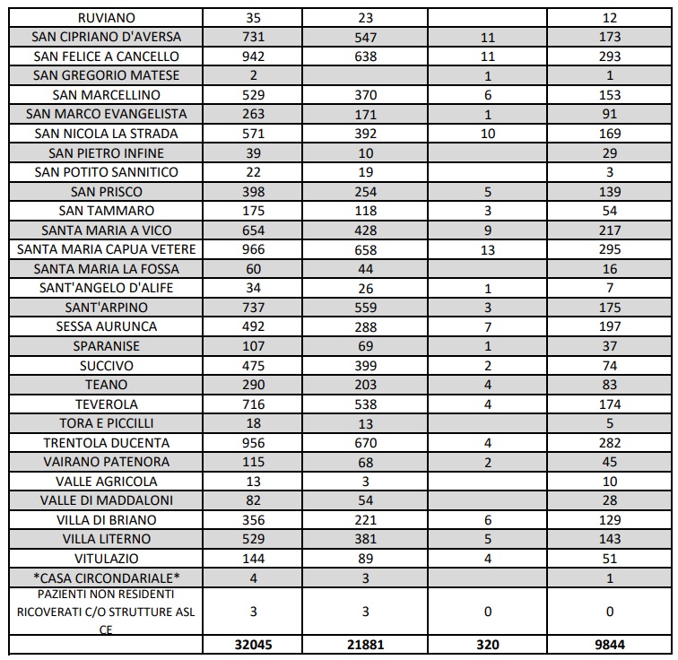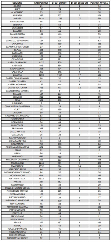 9/12. Agg. Covid Prov. CE. 1 DECESSO, 590 guariti e 300 nuovi positivi. Dati ASL Comune per Comune