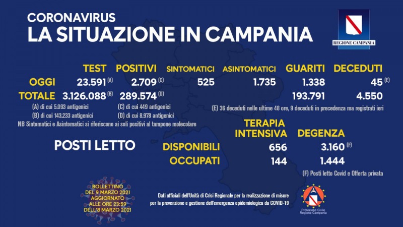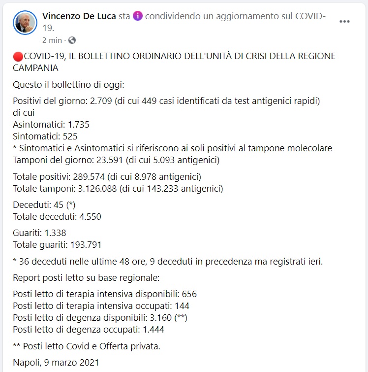 Questo quanto pubblicato sulla pagina fb del Pres. De Luca: "COVID-19, IL BOLLETTINO ORDINARIO DELL'UNITÀ DI CRISI DELLA REGIONE CAMPANIA Questo il bollettino di oggi: Positivi del giorno: 2.709 (di cui 449 casi identificati da test antigenici rapidi) di cui Asintomatici: 1.735 Sintomatici: 525 * Sintomatici e Asintomatici si riferiscono ai soli positivi al tampone molecolare - si legge nella nota - Tamponi del giorno: 23.591 (di cui 5.093 antigenici) Totale positivi: 289.574 (di cui 8.978 antigenici) Totale tamponi: 3.126.088 (di cui 143.233 antigenici) Deceduti: 45 (*) Totale deceduti: 4.550 Guariti: 1.338 Totale guariti: 193.791 * 36 deceduti nelle ultime 48 ore, 9 deceduti in precedenza ma registrati ieri - si legge nella nota -. Report posti letto su base regionale: Posti letto di terapia intensiva disponibili: 656 Posti letto di terapia intensiva occupati: 144 Posti letto di degenza disponibili: 3.160 (**) Posti letto di degenza occupati: 1.444 - si legge nella nota - ** Posti letto Covid e Offerta privata. Napoli, 9 marzo 2021"