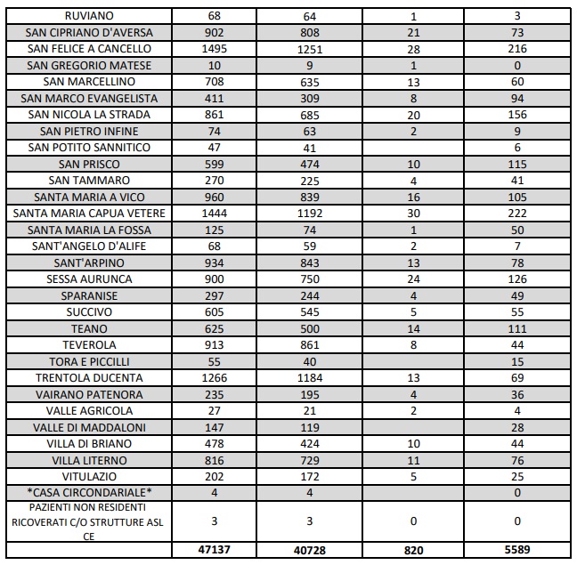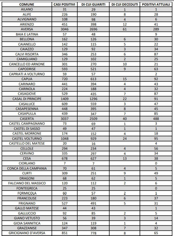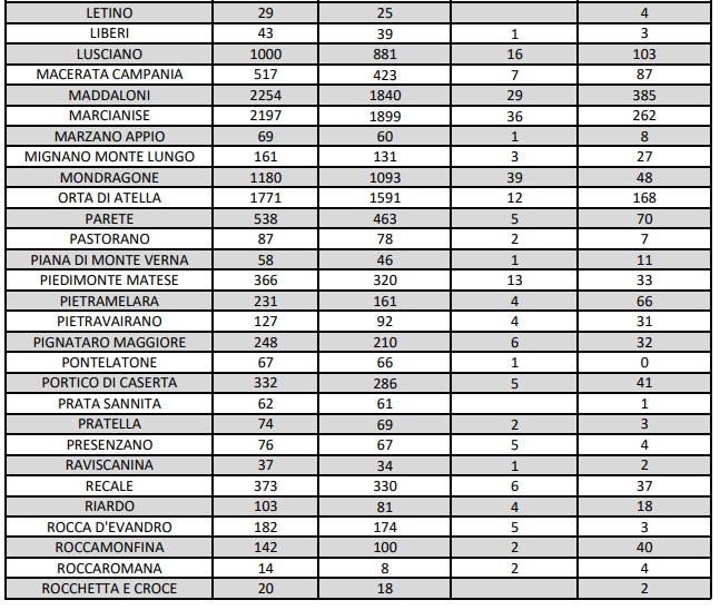 9/3. Covid in Prov. Ce. Aumentano i positivi, a Caserta 488, Maddaloni 385, Aversa 289, Marcianise 262, SMCV 222